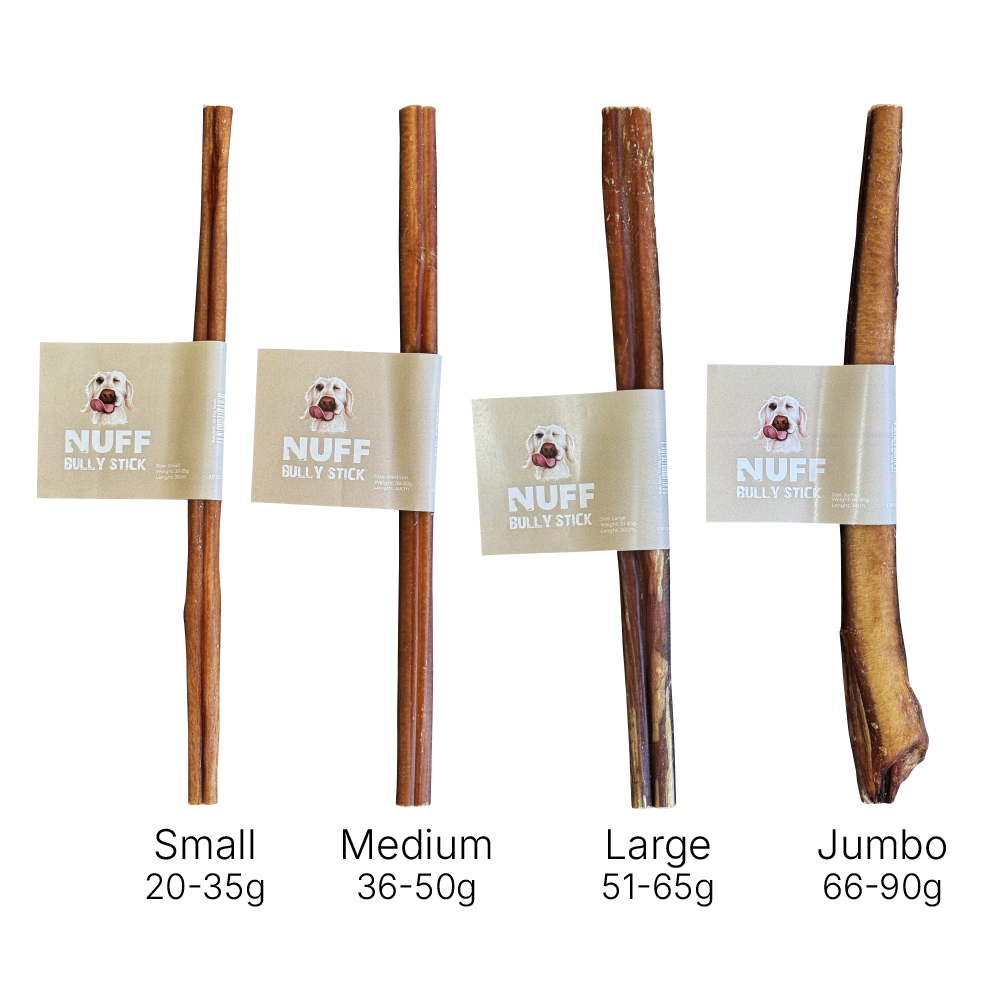 Bully Sticks have a medium-to-hard texture designed for long-lasting enjoyment. Small dogs or light chewers may find the jumbo size too large or firm. Choose the size that best matches your dog’s chewing strength, and always supervise during chew time.