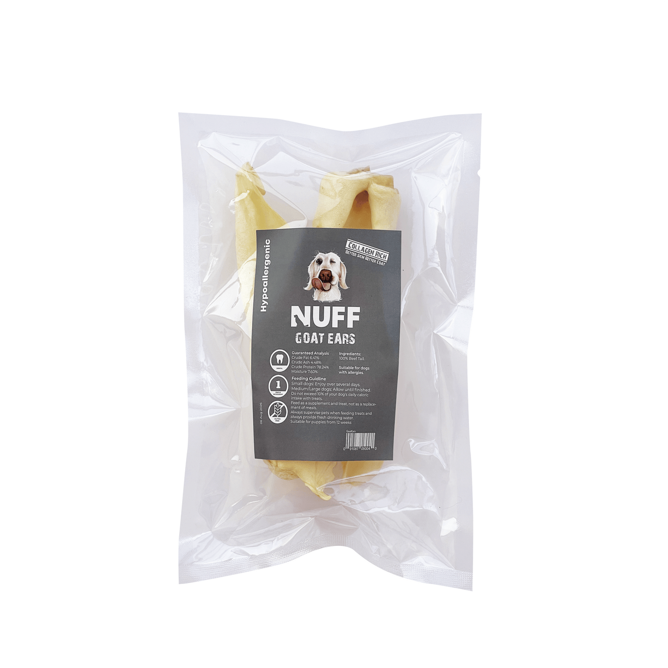 NUFF Goat Ears is a single-ingredient, eco-friendly treat made from 100% goat ears, air-dried without preservatives. High in protein, low in fat, and naturally hypoallergenic, they’re the perfect choice for dogs with sensitivities and allergies soft and ideal for older dogs, senior dogs, and puppies over 12 weeks. These chews provide collagen to support healthy skin and coat, along with glucosamine and chondroitin for joint health. Goat Ears offers a nutritious, satisfying chew that promotes dental health and mental wellness.