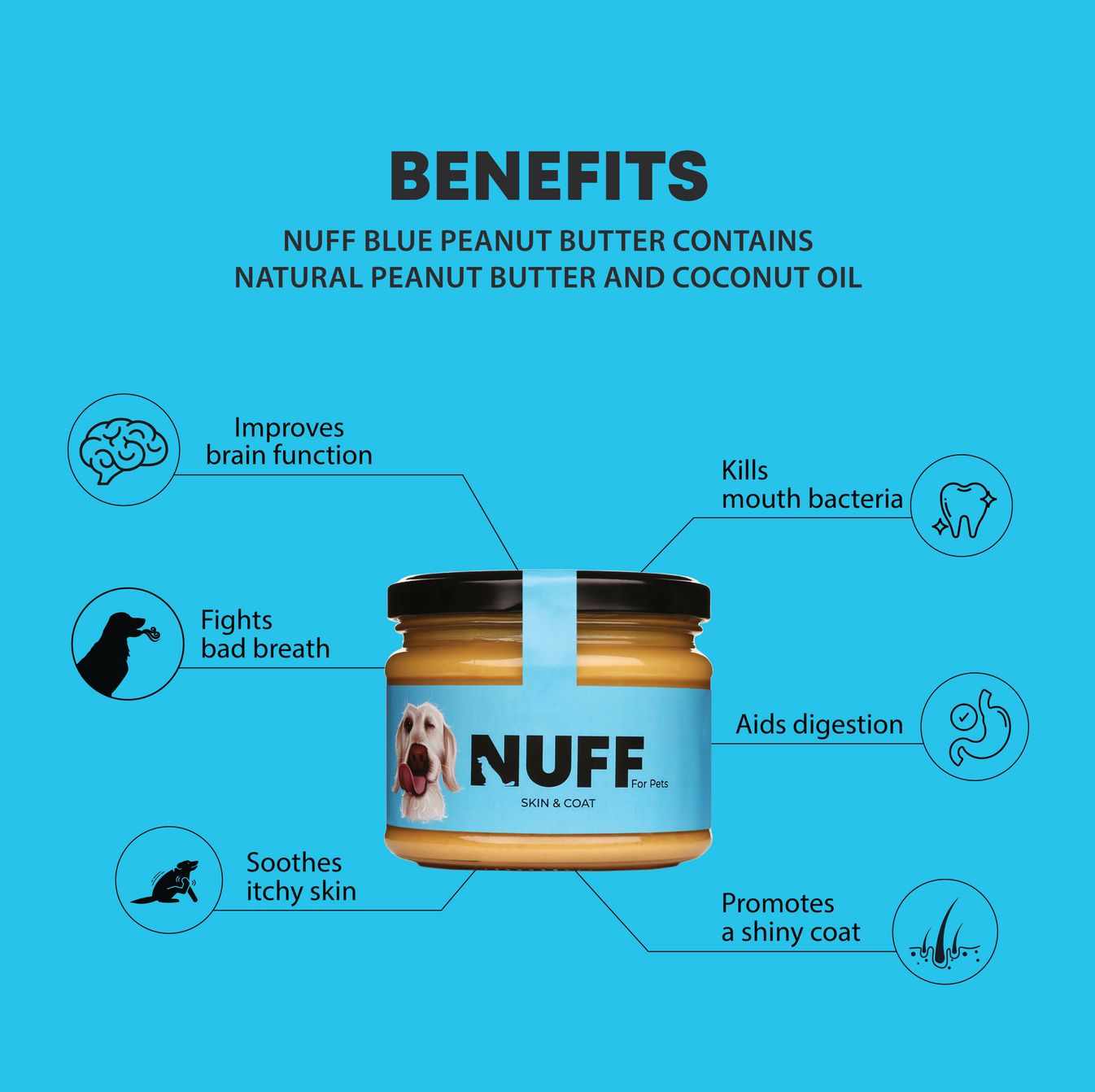 Our NUFF For Pets Blue Peanut Butter Dog Treat with Coconut blends the rich taste of natural peanut butter with the numerous benefits of coconut. This treat is designed to be both delicious and highly beneficial for your furry friend.