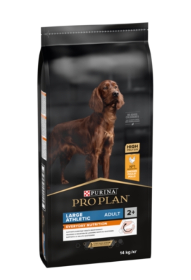Purina Pro Plan Everyday Nutrition LARGE ADULT ATHLETIC has been developed for adult dogs of large athletic breeds (more than 25 kg weight). This dry dog food contains vitamin D, minerals and specific levels of omega-3 (0.3%) to help support healthy teeth and gums. It is rich in high-quality chicken and provides optimal nutrition for your large-sized dog's adventures from 24 months to 7 years of age, when you should transition to the Age Defence formula.