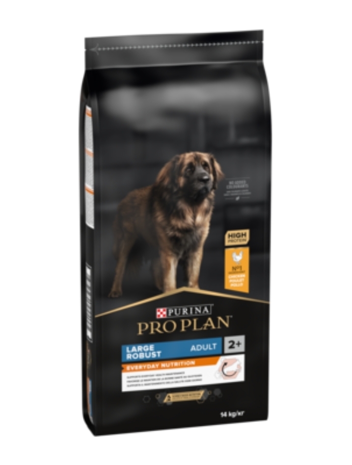 Purina Pro Plan Everyday Nutrition LARGE ADULT ROBUST has been developed for adult dogs of large robust breeds (more than 25 kg weight). This dry dog food contains vitamin D, minerals and specific levels of omega-3 (0.3%) to help support healthy teeth and gums. It is rich in high-quality chicken and provides optimal nutrition for your large-sized dog's adventures from 24 months to 7 years of age, when you should transition to the Age Defence formula.