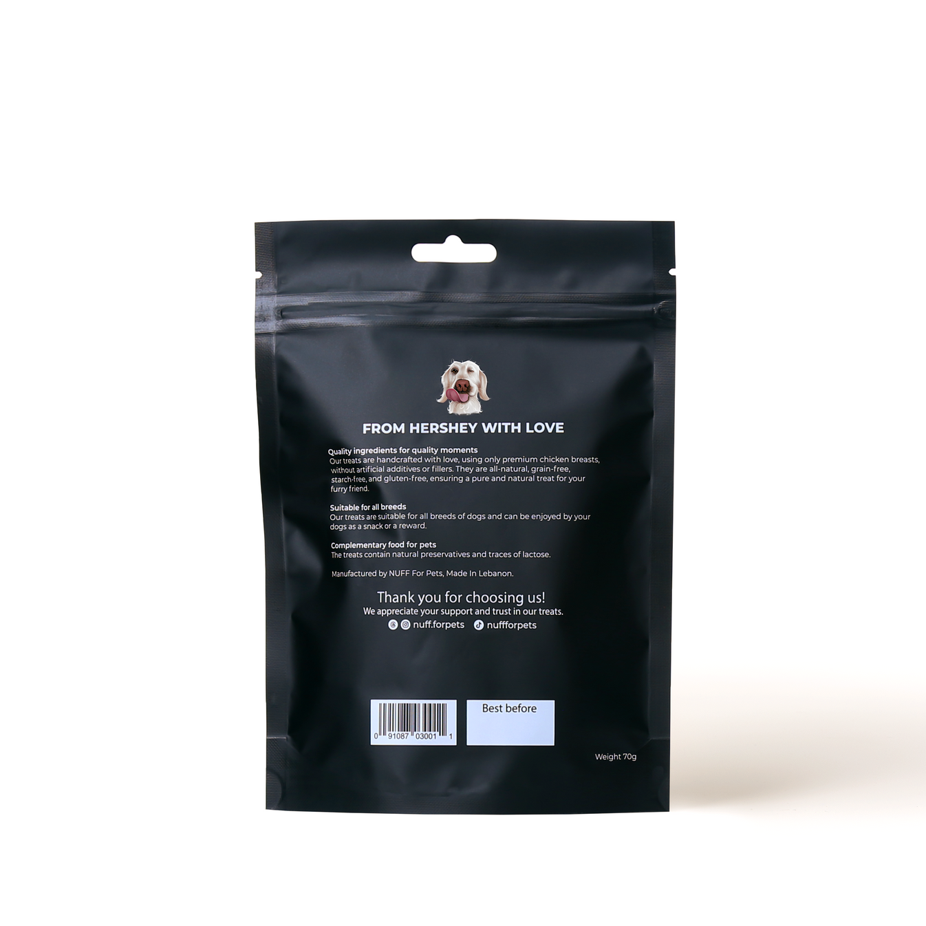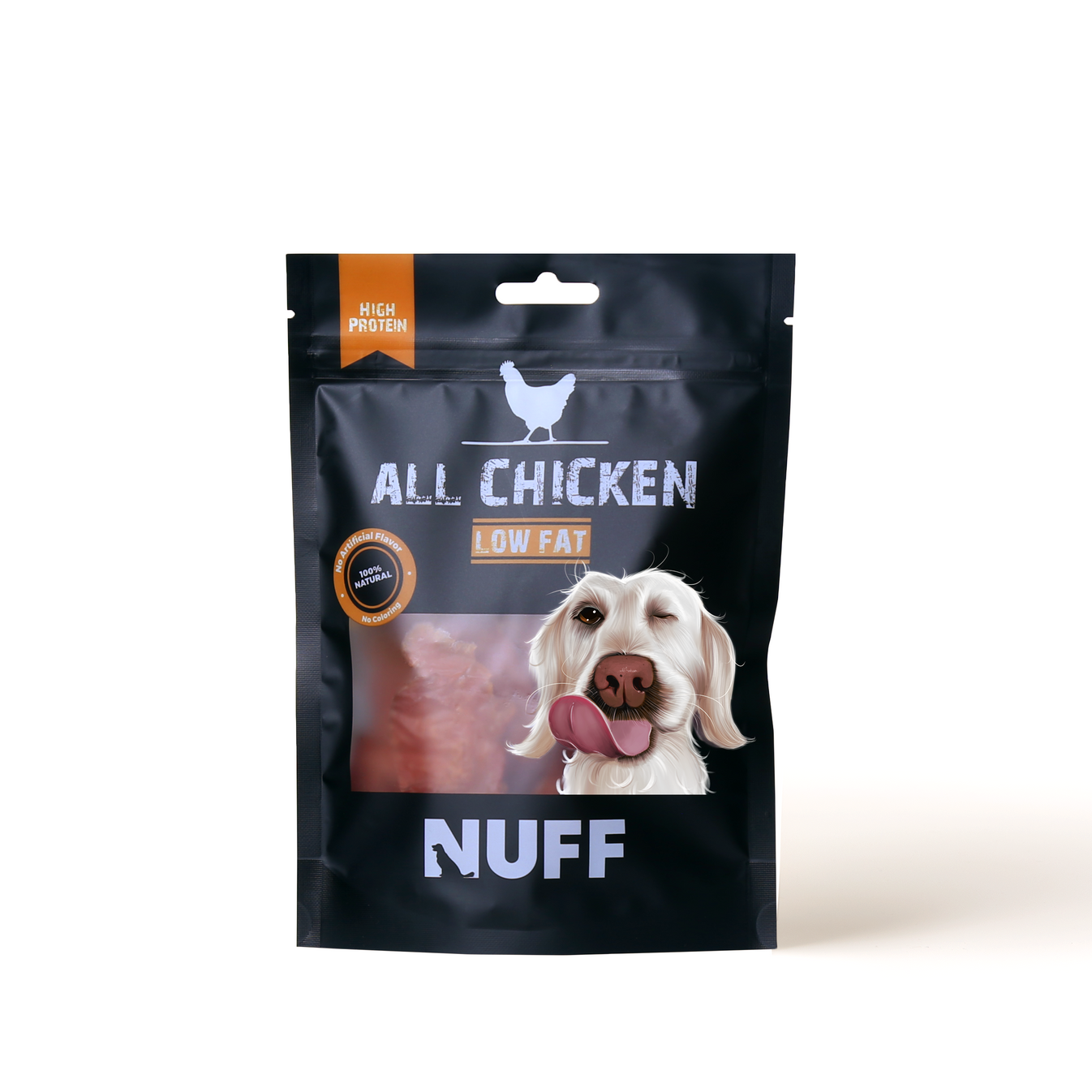 Whether you're training a young pup or rewarding a senior companion, our soft and lean chicken breast jerkys offer a delicious, nutritious, and low-fat option that dogs love. Treat your dog to the rich taste and benefits of real chicken with NUFF's premium soft jerkys!