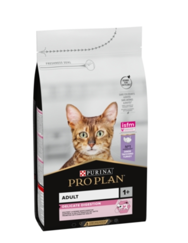 Purina Pro Plan Delicate Digestion dry cat food is formulated with turkey pieces as the first ingredient and other highly digestible selected protein sources without any wheat to help ease the digestive process. The product is highly palatable and can boost the appetite of fussy eaters.