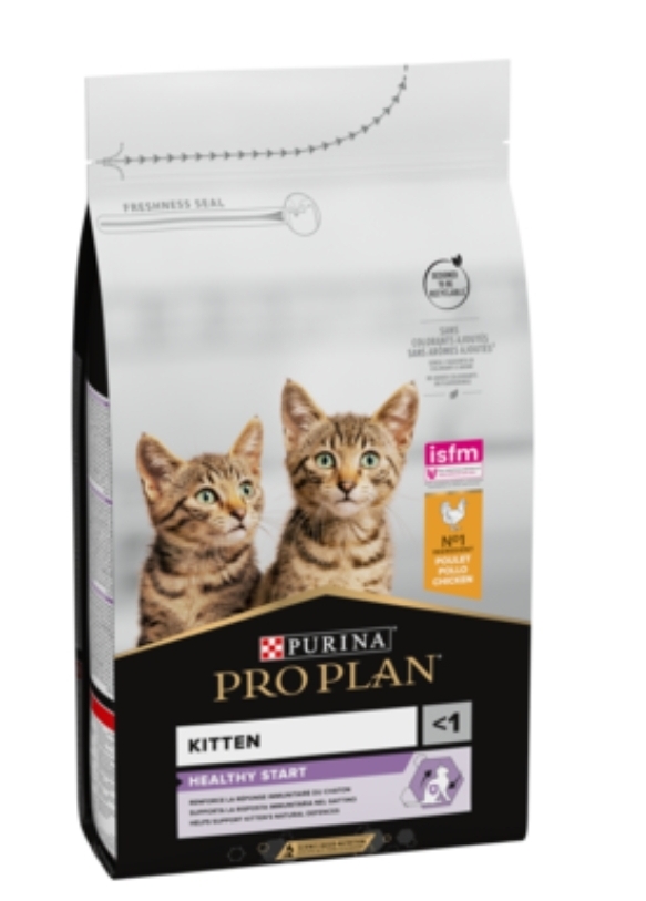 Purina Pro Plan Healthy Start contains DHA for healthy vision and brain development, high protein levels and balanced minerals to support healthy growth of bones and muscles. It is rich in high-quality chicken and provides optimal nutrition for your kitten's growth up to 12 months of age, when they will grow into adult cats.