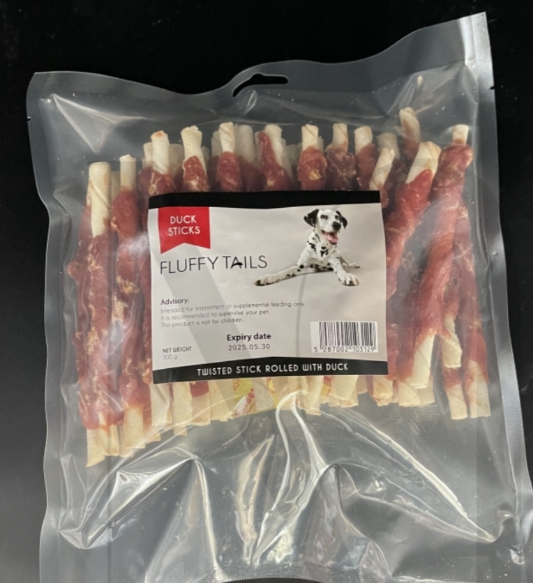 Fluffy tails dog sticks bone duck